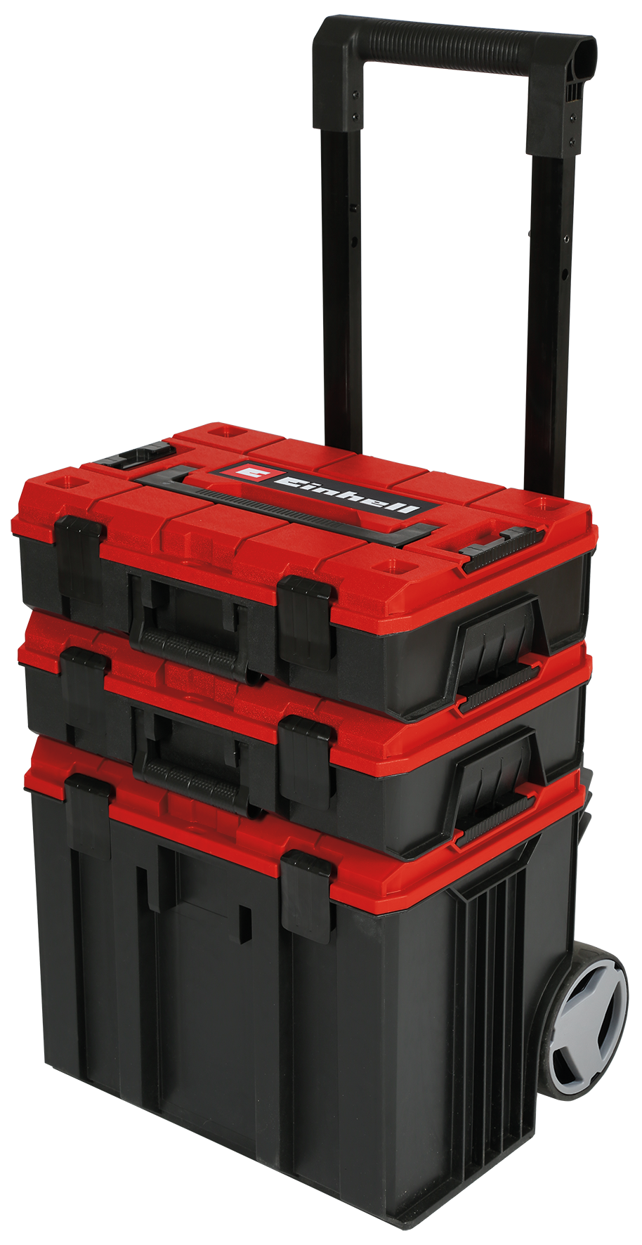 Sistema modular E-Case de Einhell. Bloqueo para conectar cajas apiladas. Carga total de hasta 120 kg. Neumáticos de goma (Ø 15 cm). Parachoques para tirar y empujar escaleras. Puede equiparse con un candado. Incluye 3x pegatinas para el etiquetado. E-Case L incl. 1x inserto. E-Case S con insertos de espuma. E-Case S con separadores. Código: 4540015