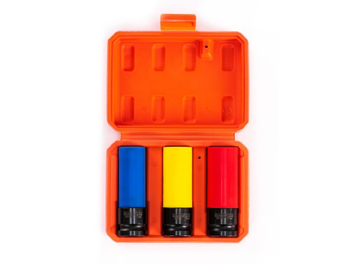 3x llaves de tubo resistentes a los impactos (17 / 19 / 21 mm). Longitud del casquillo: 80 mm. Fabricado en acero CrMo fosfatado al manganeso. La funda de plástico negro. Ideal para llantas de aleación pintadas y pulidas. Código de colores. Compatible con trinquetes y llaves de impacto con accionamiento cuadrado de 1/2″.. Código: 49109263